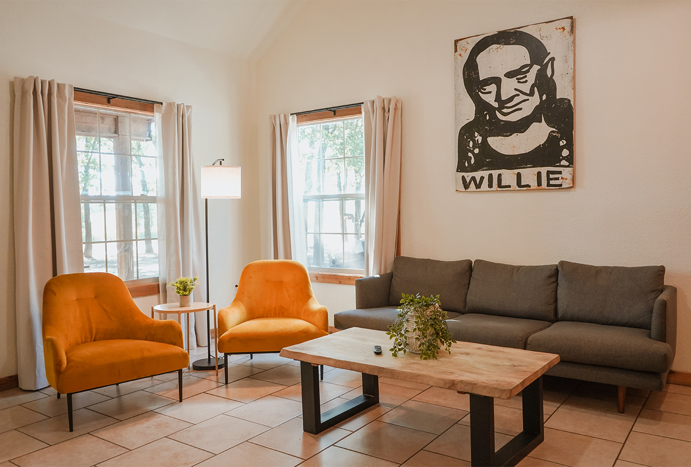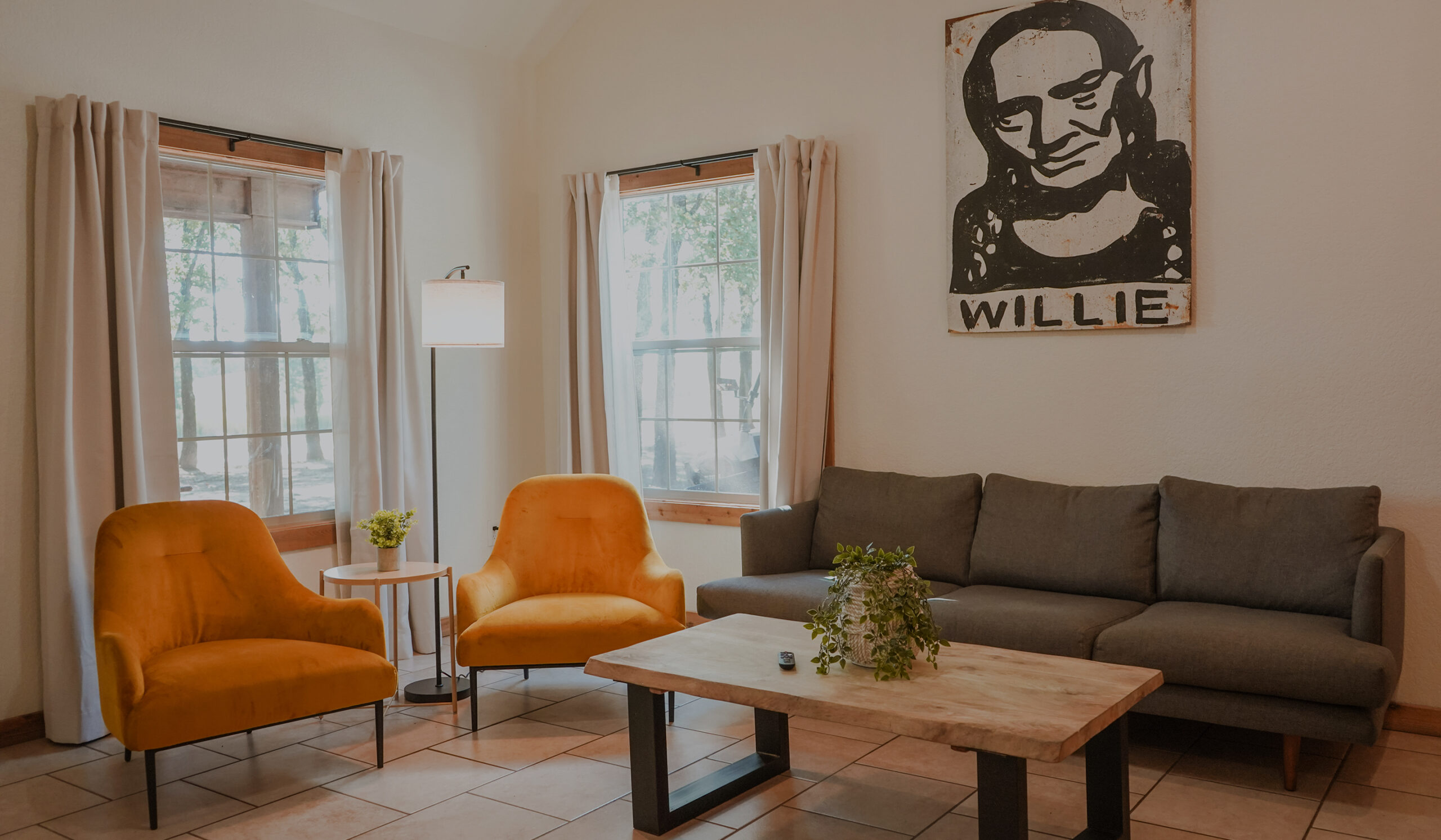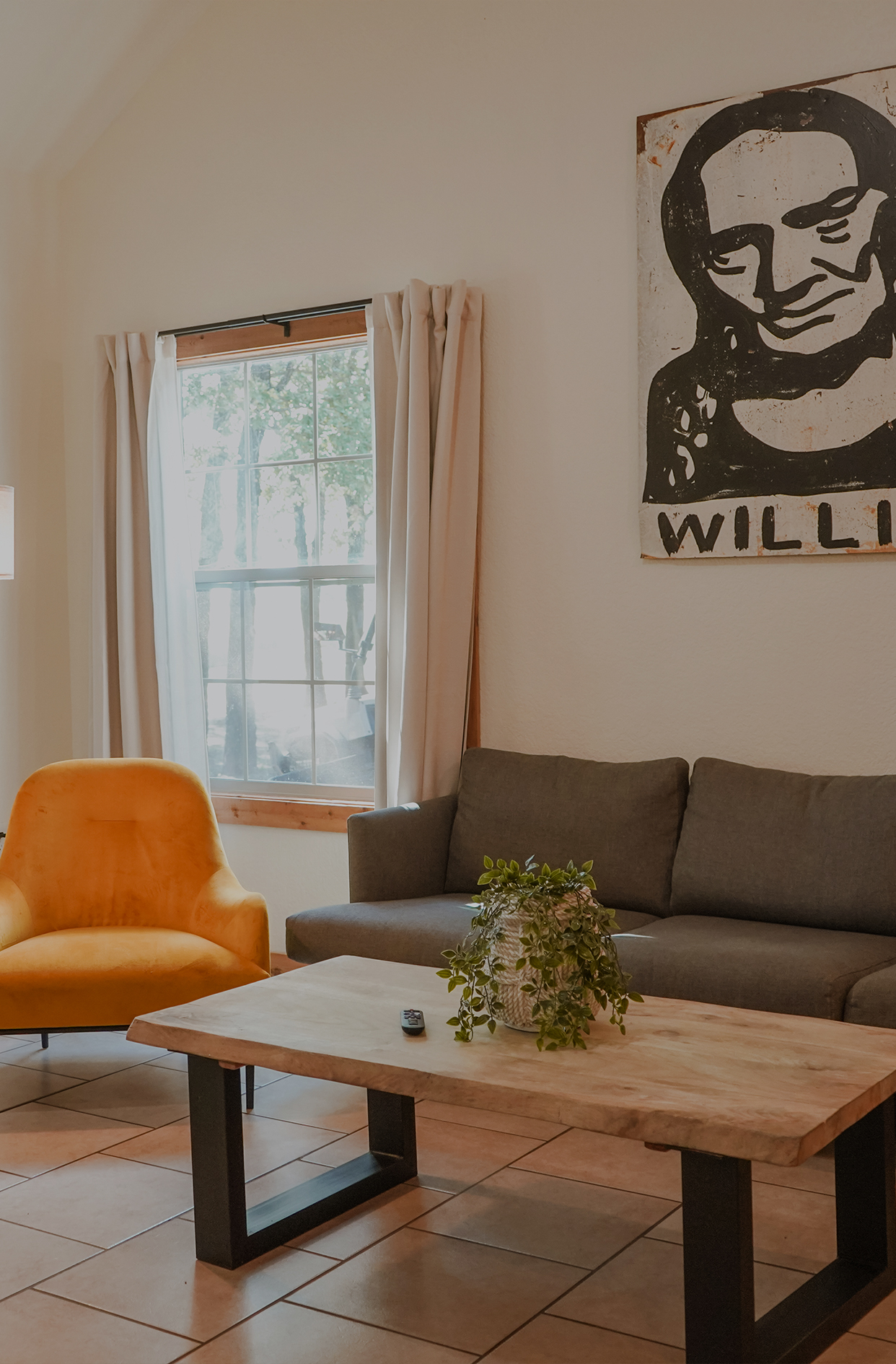Nestled along the edge of our serene cable lake and just a short stroll from Waco Beach, the Cabins offer a private retreat at the heart of the action. Wake to glassy water views, unwind on your lakeside porch, and soak in the quiet rhythm of Texas surf country. Keep an eye out for our four playful neighbors on Lemur Island – they just might swing by to say hello.