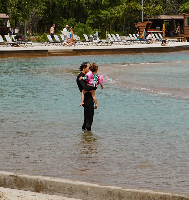- Safe, gentle shore break. One surfer (child/parent combo) per wave.