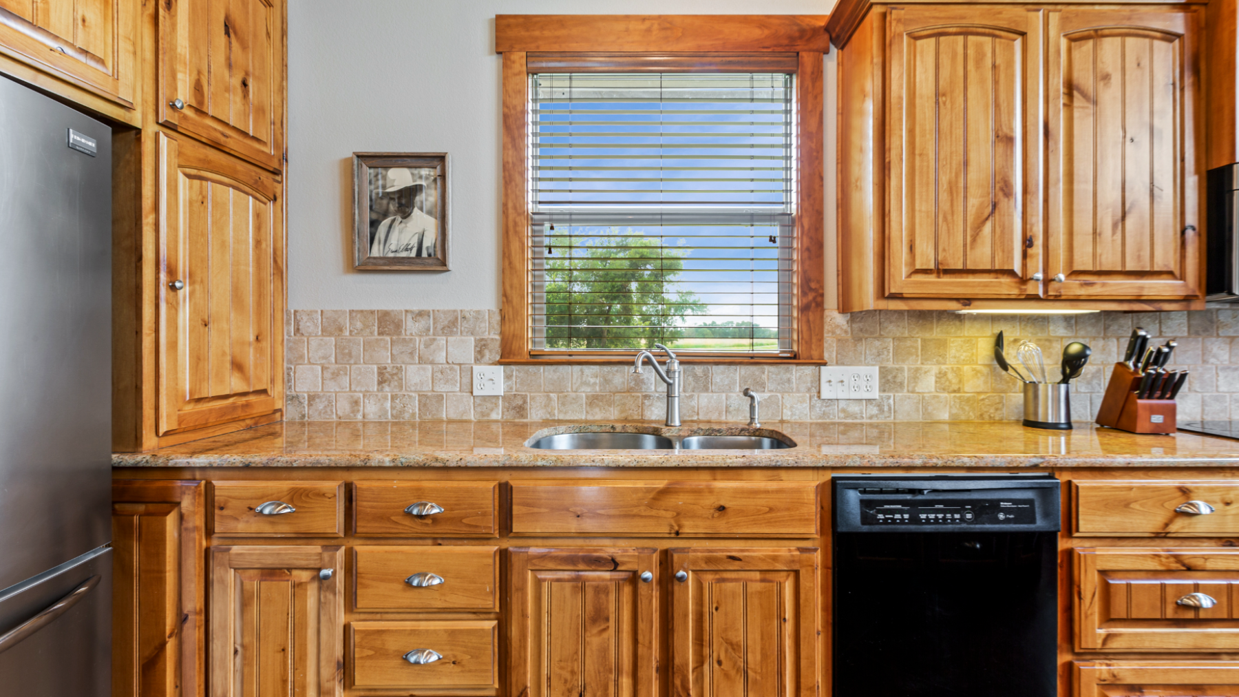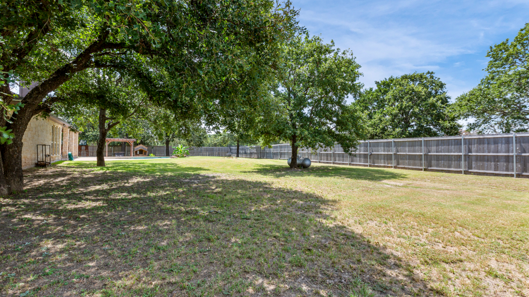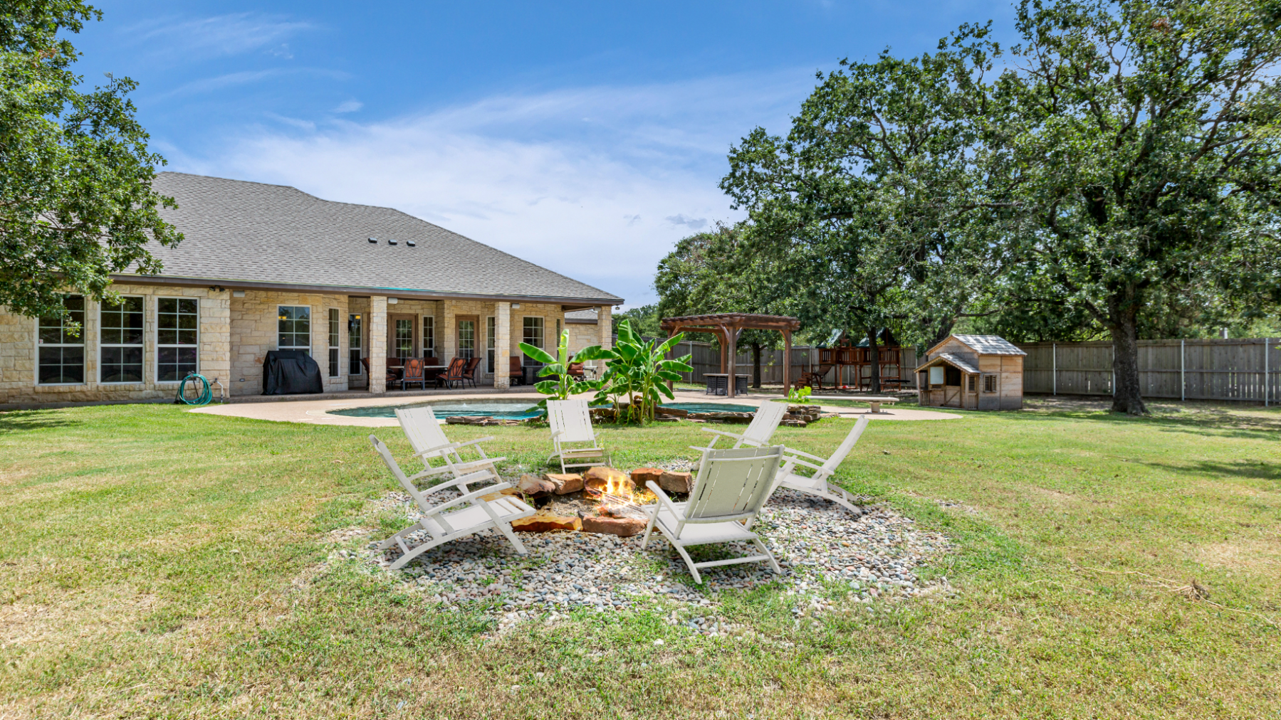 The house comes fully equipped with everything you need to cook at home, including a BBQ next to the shaded outdoor seating.