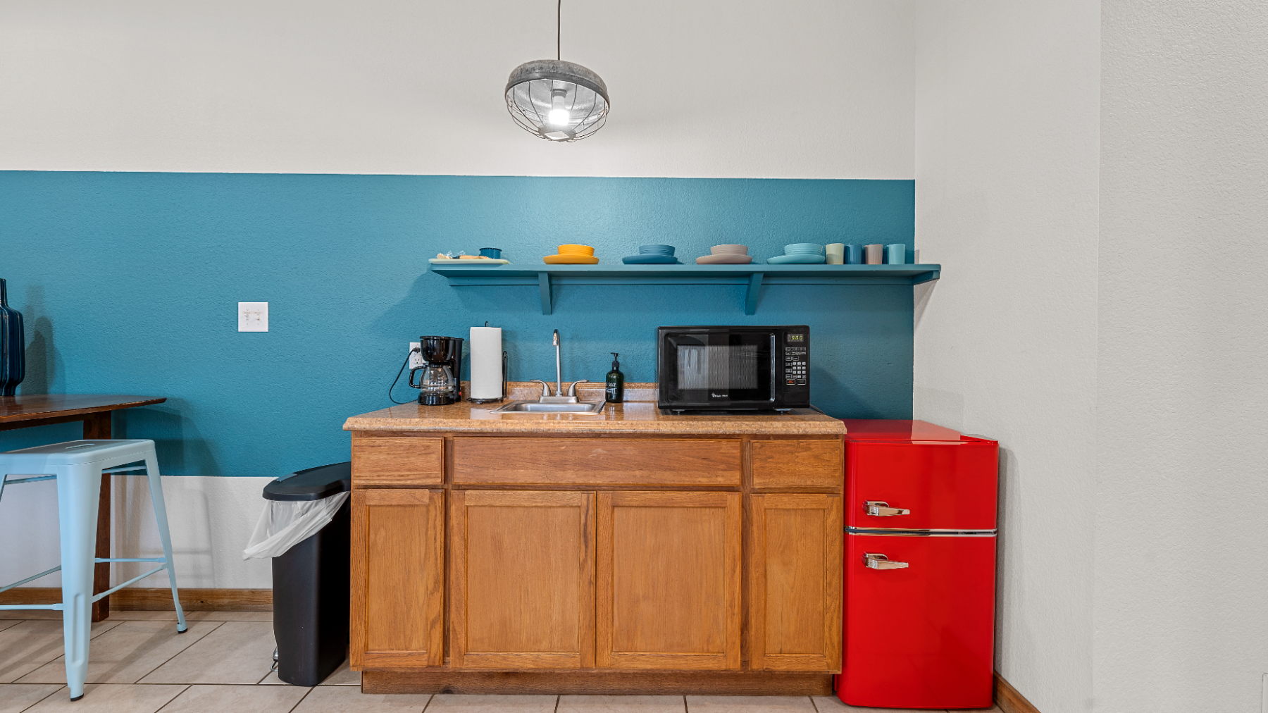 - Kitchenette comes with coffee pot and fixings, microwave, small fridge/freezer as well as cups, mugs, bowls, plates, knives, forks, spoons and a cutting board