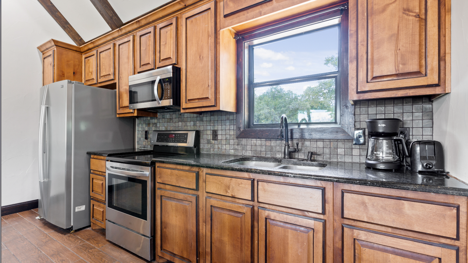 - Full kitchen with coffee pot and fixings, microwave, full oven and electric stove top, full size fridge/freezer as well as cups, mugs, bowls, plates, knives, forks, spoons, cutting board, cookware and pots and pans