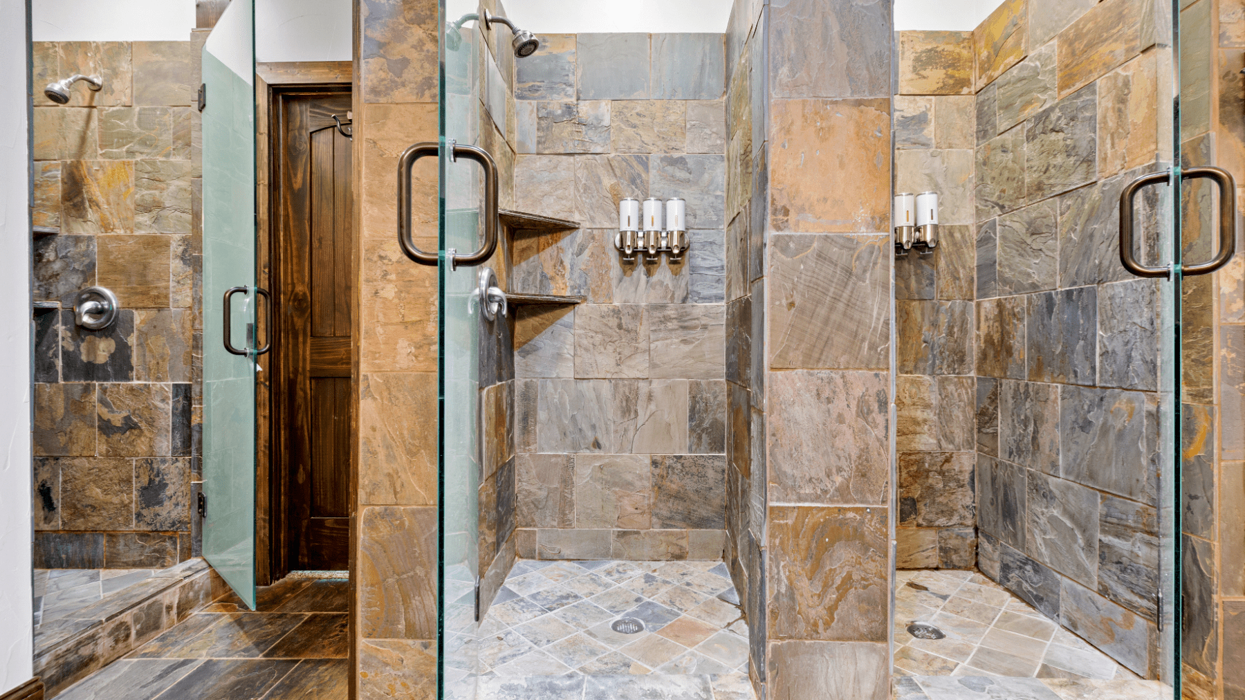 - Dorm style bathrooms with 3 shower stalls and 2 toilet stalls plus shared double sink